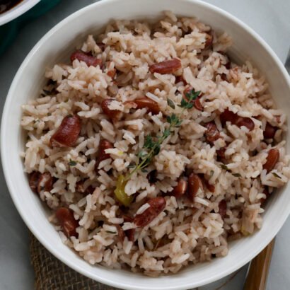 Jamaican Rice and Peas is a beloved staple in Jamaican cuisine, known for its rich flavor and comforting aroma. Despite the name, the “peas” in this dish usually refer to kidney beans or pigeon peas, which are simmered with rice in a fragrant mix of coconut milk, scallions, thyme, garlic, and Scotch bonnet pepper. This combination of ingredients creates a creamy, slightly spicy, and herbaceous flavor profile that perfectly complements a variety of main dishes, especially jerk chicken or curry goat.
